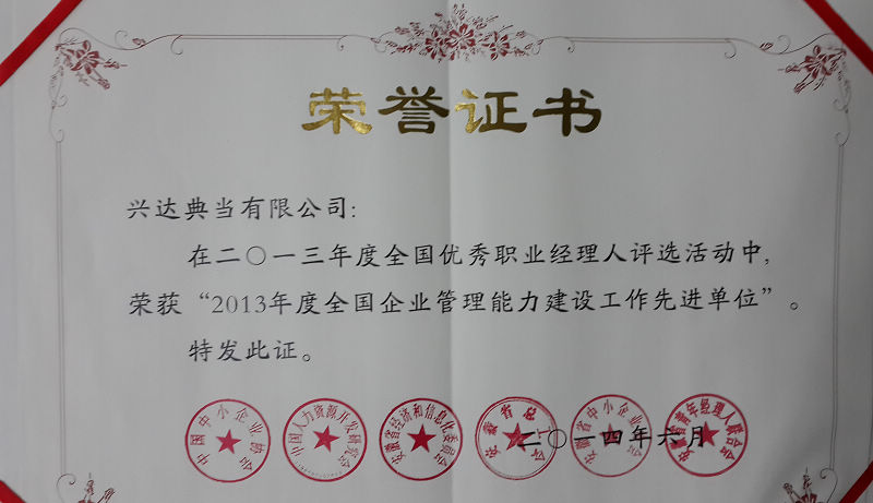日前,在合肥舉辦的2013年全國優(yōu)秀職業(yè)經(jīng)理人評(píng)選活動(dòng)中,興達(dá)典當(dāng)公司榮獲“2013年度全國企業(yè)管理能力建設(shè)工作先進(jìn)單位”稱號(hào)。