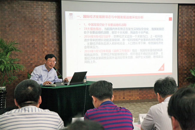 上午,陳教授做了“十九大后中國經(jīng)濟(jì)發(fā)展趨勢分析”的專題報告,結(jié)合十九大后國內(nèi)外經(jīng)濟(jì)發(fā)展新形勢,在對國際經(jīng)濟(jì)發(fā)展新常態(tài)與中國發(fā)展戰(zhàn)略環(huán)境內(nèi)在聯(lián)系研究基礎(chǔ)上,深入分析了十九大后國內(nèi)經(jīng)濟(jì)發(fā)展走勢與改革走向。下午,陳教授做了“國資國企改革的難點熱點分析”的專題報告,結(jié)合近幾年國資國企改革政策及國內(nèi)國企整體發(fā)展現(xiàn)狀,提出學(xué)習(xí)貫徹十九大精神,進(jìn)一步加快國資國企改革的必要性,在此基礎(chǔ)上,深入介紹了深化國資國企改革的具體內(nèi)容與發(fā)展趨勢。