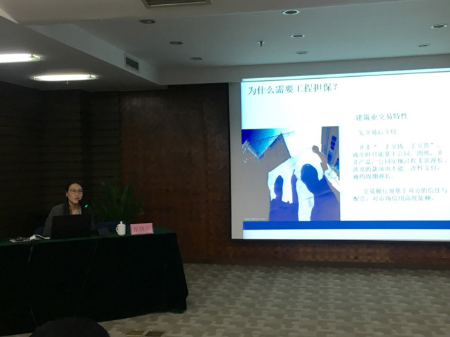合肥國控擔(dān)??偨?jīng)理助理、商業(yè)擔(dān)保部經(jīng)理張曉敏對工程履約擔(dān)保業(yè)務(wù)進行了全面解析,并重點介紹了履約擔(dān)保、投標(biāo)擔(dān)保、預(yù)付款擔(dān)保、質(zhì)量保證擔(dān)保等業(yè)務(wù)產(chǎn)品以及風(fēng)險管理和業(yè)務(wù)創(chuàng)新等方面業(yè)務(wù)知識。