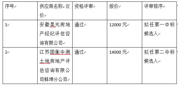 高鐵蚌埠南站西廣場、蚌投科技園物業(yè)服務費評估項目于2021年10月18日發(fā)布招標公告,經(jīng)兩次流標,第三次招標公共于2021年11月04日發(fā)布,2021年11月11日9:00本項目開標,三家報名現(xiàn)場兩家參與,按招標文件要求現(xiàn)場議價,經(jīng)過專家評審,經(jīng)與投標單位溝通均表示不再下浮,按招標文件要求符合議價程序?,F(xiàn)公告排名如下: